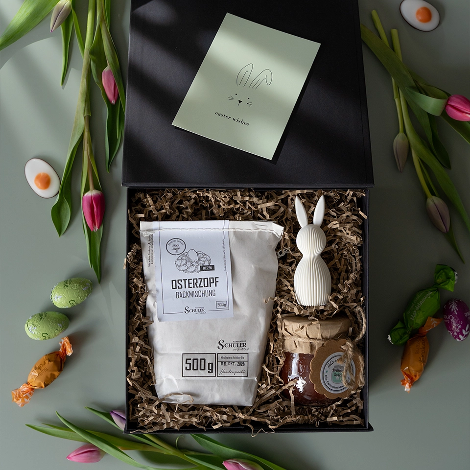 Die Geschenkbox in deiner Firmenfarbe, mit deinem Logo, deiner Grußkarte und mit deinen ausgewählten Produkten? Mit einer individuellen Verpackung und personalisierten Inhalten kannst du deine Marke und ihre Werte effektiv präsentieren und machst die Box zu deinem Firmengeschenk.