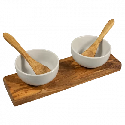 Zwei Dipschalen aus feinem Porzellan (Ø 8,5cm) auf einem formschönen Olivenholz-Fuß mit passgenauer Einfassung. Zwei handliche Löffel aus Olivenholz sind inklusive und machen das Set komplett. Ideal für die edle Präsentation von Antipasti, Chips & Co.