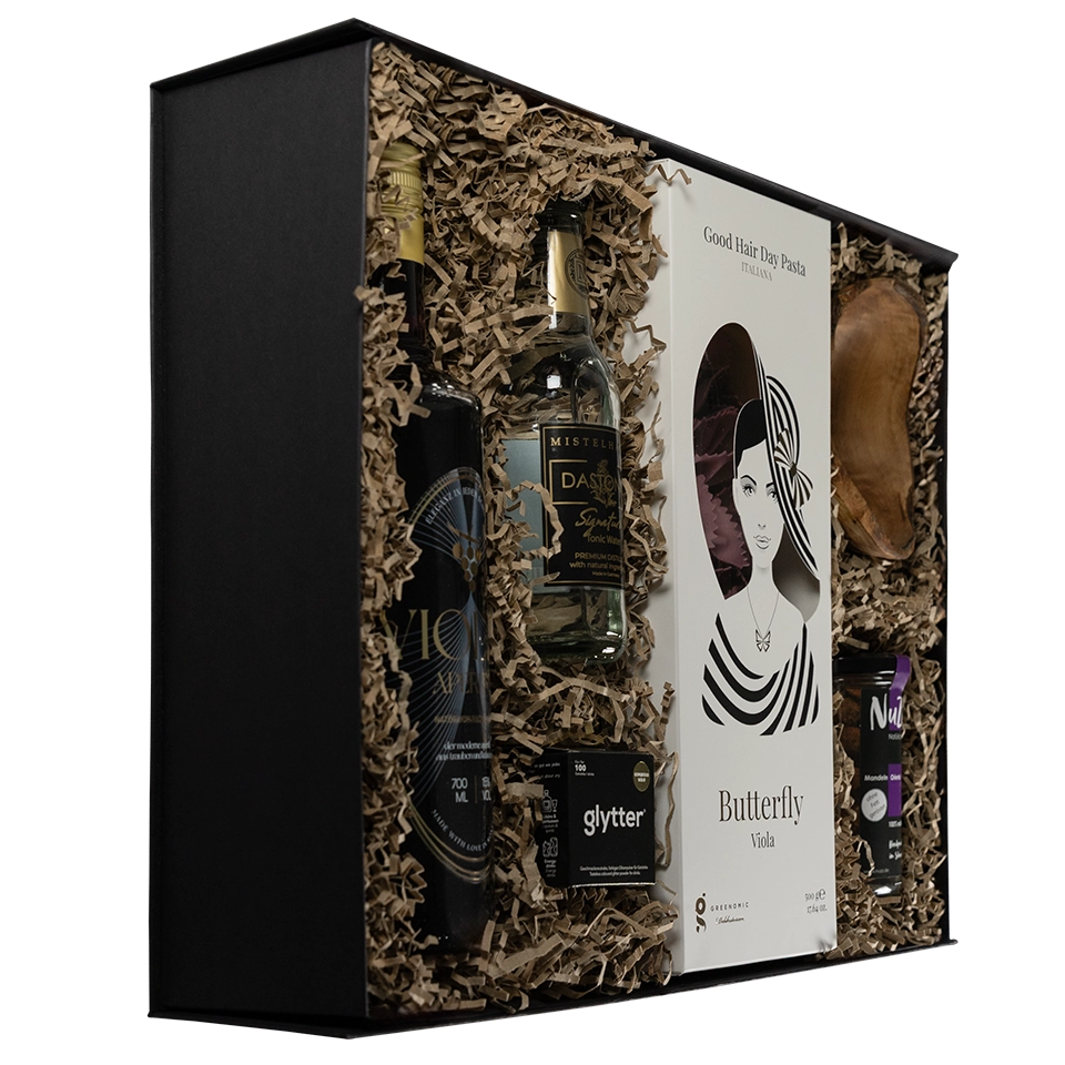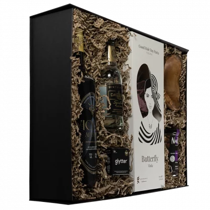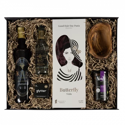 Unsere lila Box ist perfekt für alle, die einen echten Wow-Moment verdienen. Der exklusive Aperitif "Violet" lässt sich mit dem beiliegenden Tonic Water zu einem violetten Tonic mixen. Wer es noch spektakulärer mag, kann mit dem goldenen Pulver dem Getränk zusätzlichen Glanz verleihen. Als passende Begleitung dienen die orientalischen Mandeln, stilvoll in einer Olivenholz-Schale präsentiert. Abgerundet wird das lila Erlebnis durch die Feinkost-Nudeln "Butterfly", die ihre besondere Farbe den violetten Karotten verdanken. Eine Box, die Genuss und Überraschung auf besondere Weise vereint.I'm a box. I'm a present.