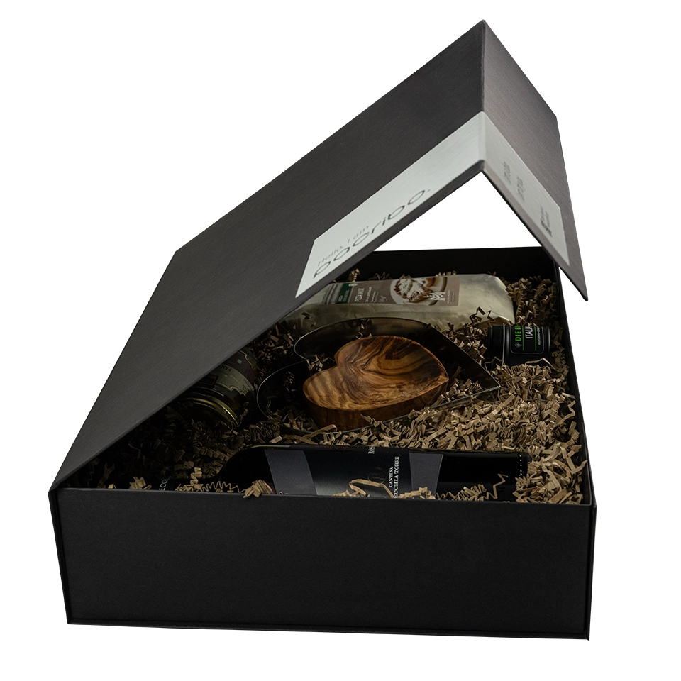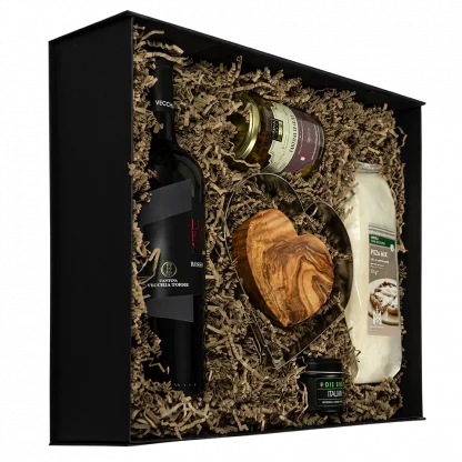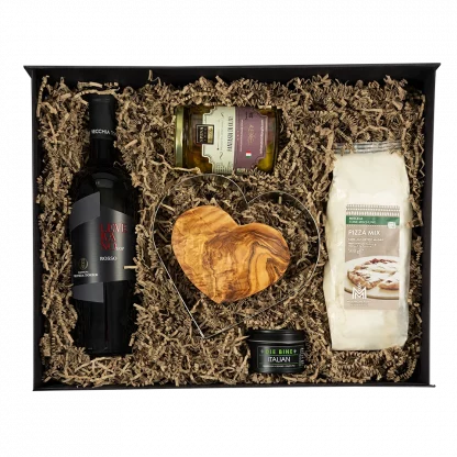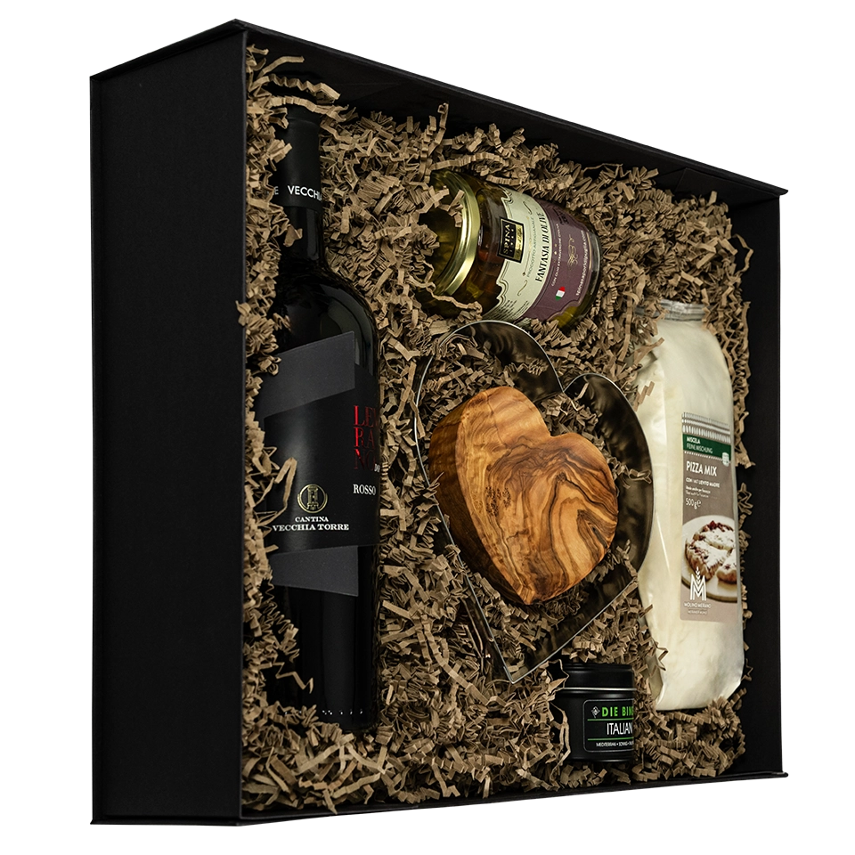 Die Box ist für echte Pizza-Liebhaber, die aus Teig kleine Liebeserklärungen machen wollen. Die Pizzateigmischung lässt sich mit Olivenöl und Wasser schnell zum perfekten Teig verarbeiten – und für alle, die glutenfrei genießen möchten, gibt es sie auch in einer glutenfreien Variante. Mithilfe des Herzausstechers wird aus dem Teig eine charmante Liebeserklärung. Für die Extraportion Romantik sorgen der edle Rotwein und die Herzschale aus Olivenholz, die die beigefügten Oliven perfekt in Szene setzt. Die aromatische Italian-Gewürzmischung rundet mit mediterranem Flair den Geschmack der Pizza ab. Mit dieser Box steht einem unvergesslichen Abend voller Amore nichts mehr im Weg.I'm a box. I'm a present.