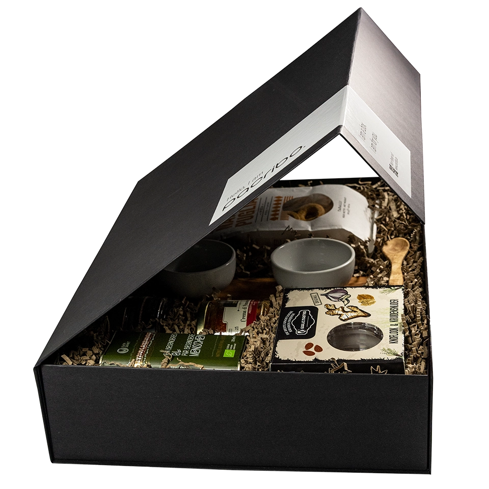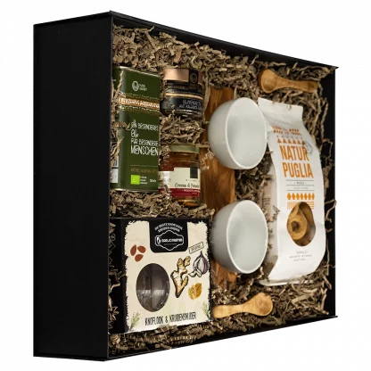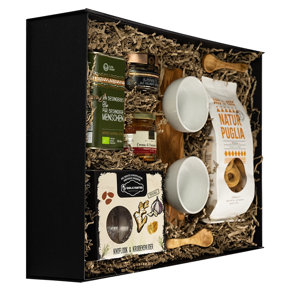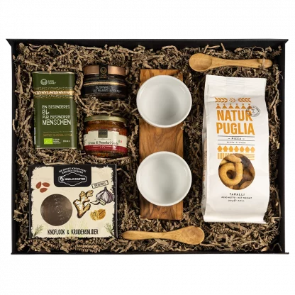Diese Box enthält alles, was für eine gelungene mediterrane Vorspeise benötigt wird: Knusprige Taralli in den Sorten Pizza, Fenchel oder Peperoncino, ein hochwertiges Olivenöl sowie fein abgestimmte Cremes aus Oliven und getrockneten Tomaten – ideal zum Dippen, Snacken und Teilen. Wer noch mehr Geschmack ins Spiel bringen möchte, kann mit dem Garlicmaster im Handumdrehen Knoblauch, Nüsse, Zwiebeln oder Kräuter schälen und zerkleinern – perfekt für selbstgemachte Dips. Stilvoll angerichtet wird alles in zwei Keramikschalen auf einer edlen Olivenholzplatte. Eine liebevoll zusammengestellte Box voller Geschmack, ideal für Genießer und mediterrane Momente.I'm a box. I'm a present.