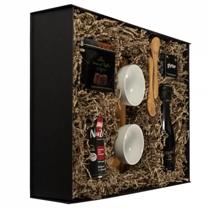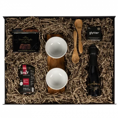 Stil und Genuss in einer Box vereint. Zwei Porzellan-Dipschalen auf Olivenholz-Fuß setzen die leckeren Schwarzwald-Pekannüsse, karamellisiert mit Bio-Ahornsirup und aromatischen Gewürzen, sowie die zart auf der Zunge zergehenden Premium-Trüffel-Pralinen perfekt in Szene. Der edle Gourmet-Schaumwein „Chocolate in a Bottle“ aus Südfrankreich entfaltet Noten von dunkler Schokolade und Haselnuss. Ein Hauch des goldenen Glytters verwandelt den Schaumwein in ein funkelndes Highlight – einfach einrühren und genießen.I'm a box. I'm a present.