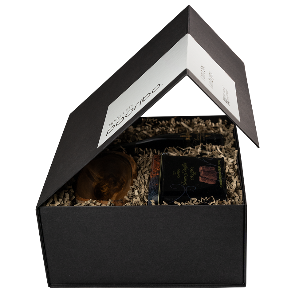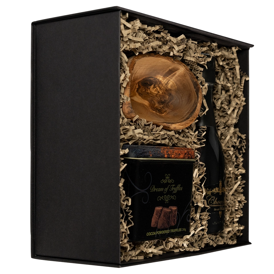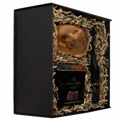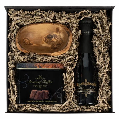Edle Trüffel-Schokoladenpralinen treffen auf einen besonderen Gourmet-Schaumwein mit einer Note von dunkler Schokolade und Haselnussextrakt . Die hochwertige rustikale Schale aus Olivenholz ergänzt das Arrangement als stilvolles Detail und unterstreicht die edle Komposition. Das Zusammenspiel aus süßer Raffinesse, prickelnder Eleganz und natürlicher Ästhetik macht diese Zusammenstellung zu einem exklusiven Genussmoment voller Stil und Charakter.