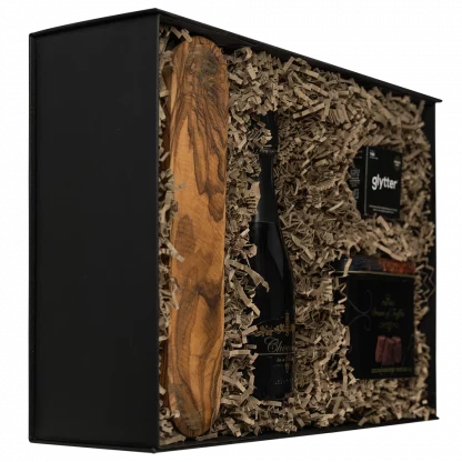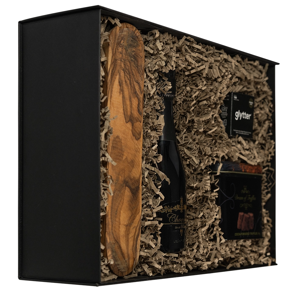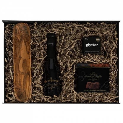 Zartschmelzende Premium-Trüffel aus Schweden und der erlesene Chocolate in a Bottle mit Schokoladen- und Haselnussnoten bilden das Herz dieser Zusammenstellung. Die einzigartige Olivenholzschale bringt Wärme und Natürlichkeit ins Arrangement, während das goldene Glitzerpulver einen funkelnden Akzent setzt und jedem Moment festlichen Glanz verleiht.