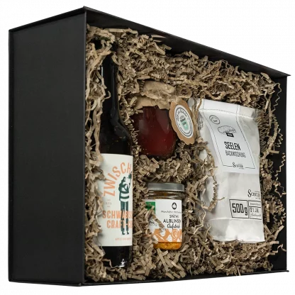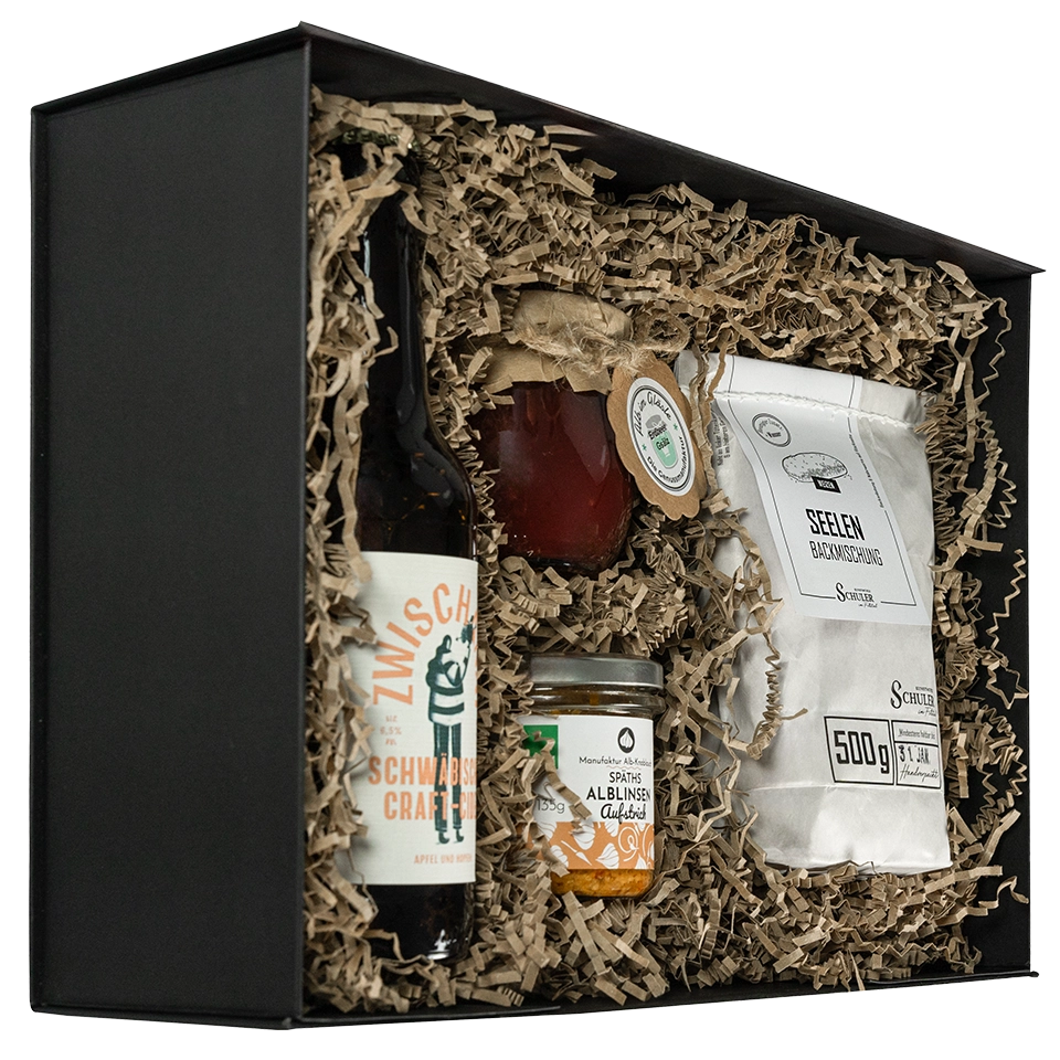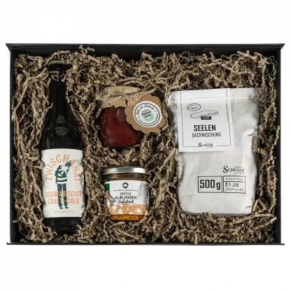 Die Vielfalt der schwäbischen Küche in einer Box! Ein erfrischender Cider aus den Früchten schwäbischer Streuobstwiesen sorgt für einen fruchtigen Genuss. Die traditionelle schwäbische Brotspezialität „Seelen“ begeistert sowohl herzhaft als auch süß – perfekt für jeden Geschmack! Dafür einfach die Backmischung mit Wasser mischen, den Teig ruhen lassen, formen und backen. Gelingsicher für Schwaben und alle, die es werden wollen. Die Seelen können dann mit dem deftigen Brotaufstrich aus Knoblauch und schwäbischen Linsen oder mit süßer Erdbeermarmelade (Gsälz) bestrichen werden. An guada!I'm a box. I'm a present.