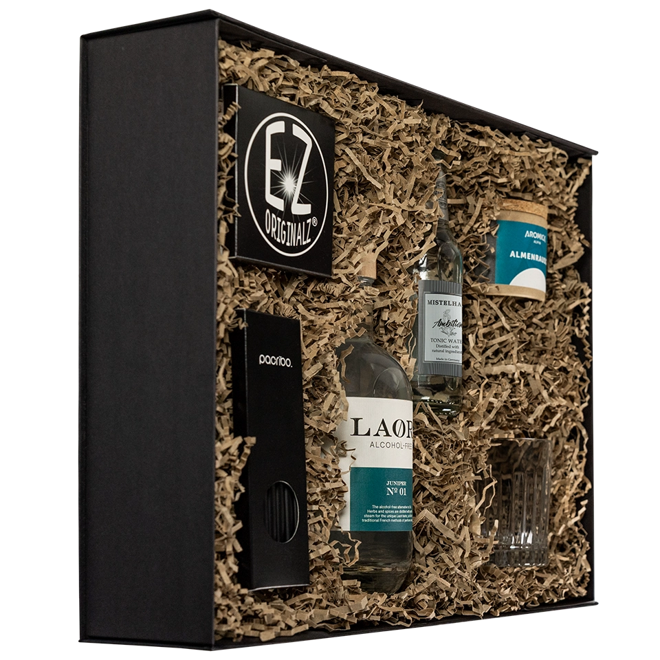 Diese Gin-Box vereint alkoholfreien Genuss mit hochwertigem Design und außergewöhnlichen Geschmackserlebnissen. Der alkoholfreie Gin besticht durch frische, kräuterbetonte Noten von Wacholder, Kardamom und Rosmarin und entfaltet sein volles Aroma besonders in Kombination mit dem milden Tonic Water. Stilvolle Accessoires wie ein formschönes Whiskyglas, matt schwarze Strohhalme und ein LED-Untersetzer in Marmoroptik setzen jeden Drink perfekt in Szene. Abgerundet wird die Box durch eine alpine Dessertmischung, die Drinks und Desserts eine feine Süße verleiht. Eine ideale Geschenkidee für alle, die Genuss, Stil und Kreativität ohne Alkohol lieben.I'm a box. I'm a present.