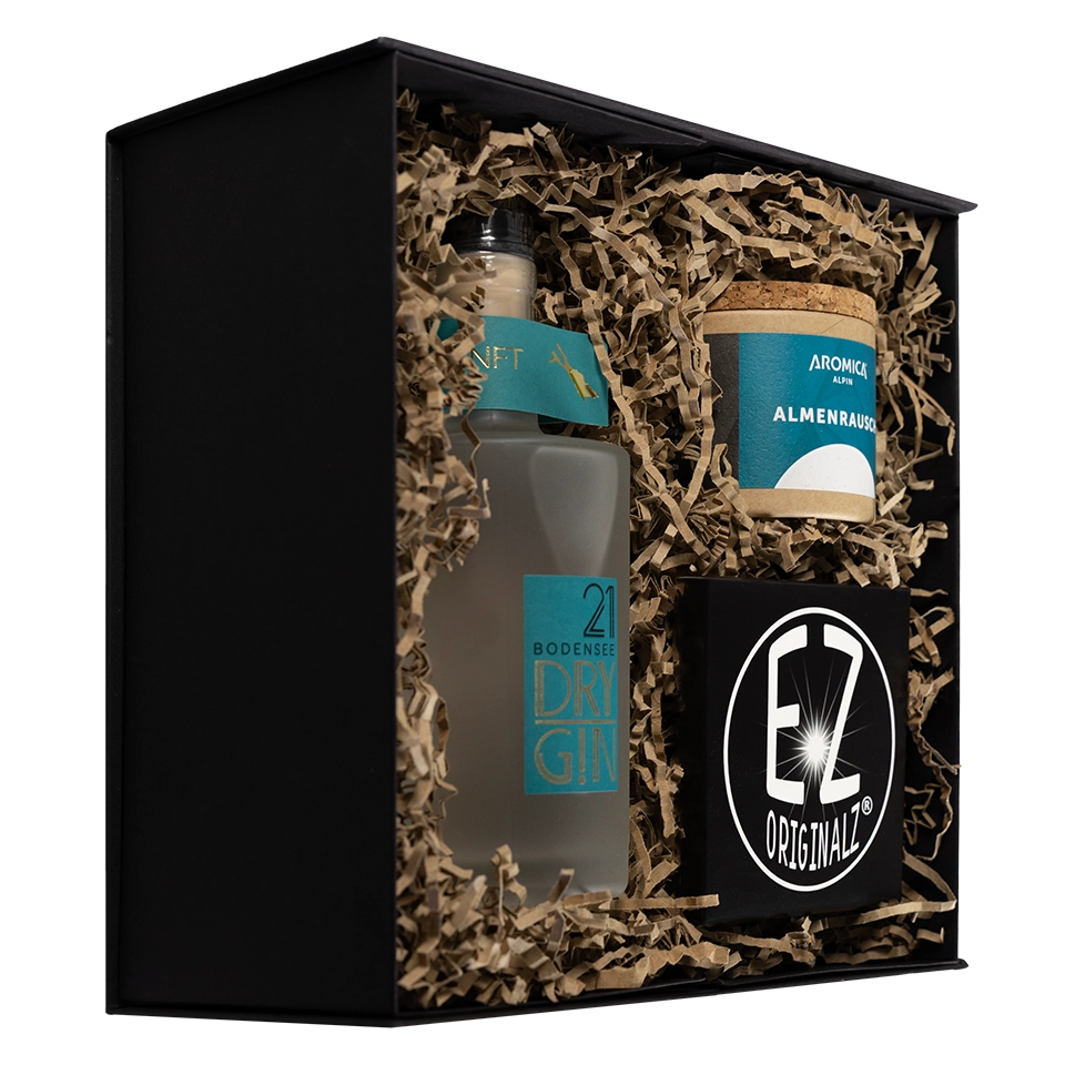 Gin-Genuss vereint mit hochwertigem Design und außergewöhnlichen Geschmackserlebnissen. Du kannst zwischen der Variante mit Alkohol und der alkoholfreien Alternative wählen. DRY GIN mit fruchtigen Zitrusnoten und einem Hauch von Salbei mit Muskatteller-Trauben-Akzent oder der Laori Juniper No 01 ohne Alkohol, der durch frische, kräuterbetonte Noten von Wacholder, Kardamom und Rosmarin besticht. Ein LED-Untersetzer in Marmoroptik setzt den Drink perfekt in Szene und eine alpine Dessertmischung, die Drinks und Desserts eine feine Süße verleiht rundet die Box ab.I'm a box. I'm a present.