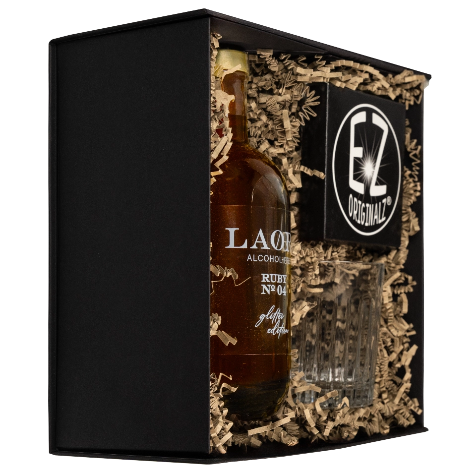 Strahlend, funkelnd und besonders – so präsentiert sich der Ruby No.4. Essbare Goldpartikel bringen den alkoholfreien Aperitif zum Glitzern und machen ihn zum orange-goldenen Highlight. Serviert im stilvollen Schott Zwiesel Glas kommt er besonders gut zur Geltung – modern im Design, hochwertig in der Verarbeitung. Der LED-Untersetzer in dunkler Marmoroptik taucht das Glas in sanftes, warmweißes Licht und verleiht jedem Sommerabend das gewisse Extra.