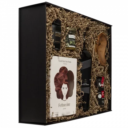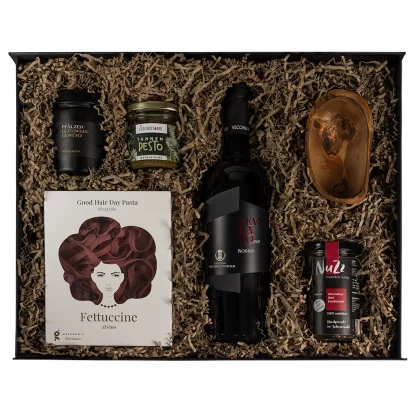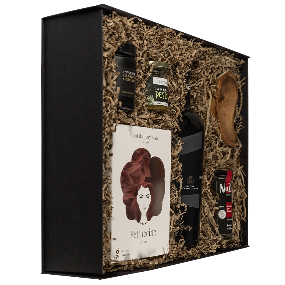 Winterliche Aromen vereint in stilvoller Form. Das Tannenpesto verleiht den Rotwein-Nudeln eine frische, winterliche Note, während die Pekannüsse aus dem Schwarzwald in der Olivenholzschale als köstlicher Snack serviert werden können. Der rubinrote Leverano Rosso ist vollmundig und samtig im Geschmack und passt hervorragend zu den Nudeln. Mit dem beiliegenden Glühweingewürz lässt sich daraus ein aromatischer Glühwein zubereiten – ideal für gemütliche Winterabende.I'm a box. I'm a present.