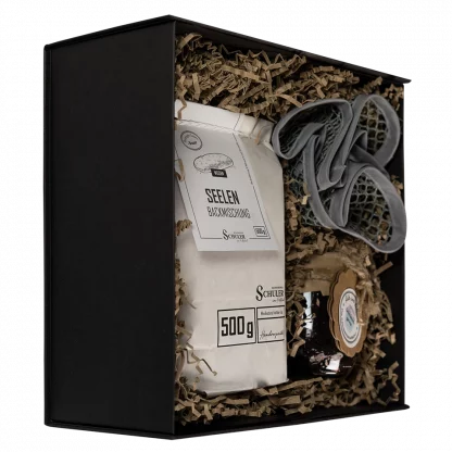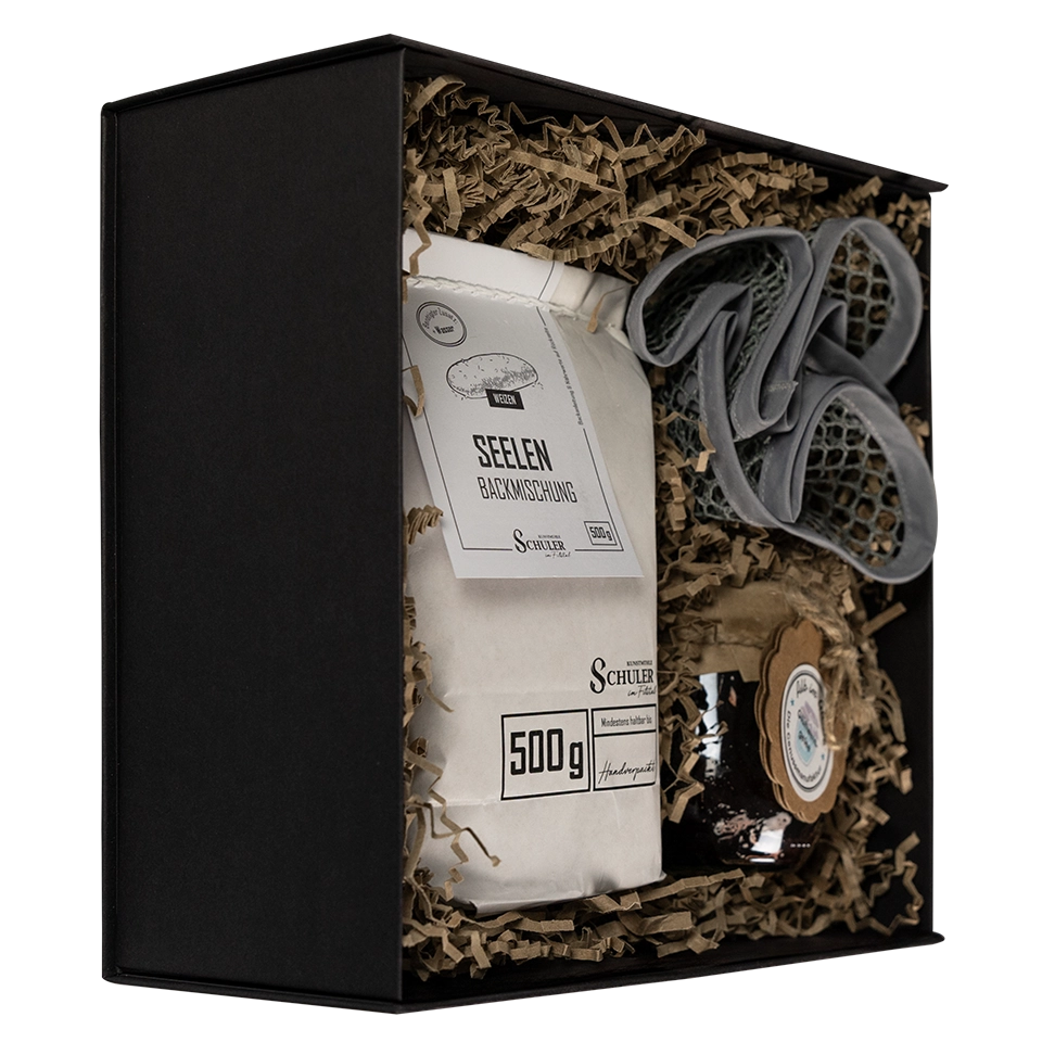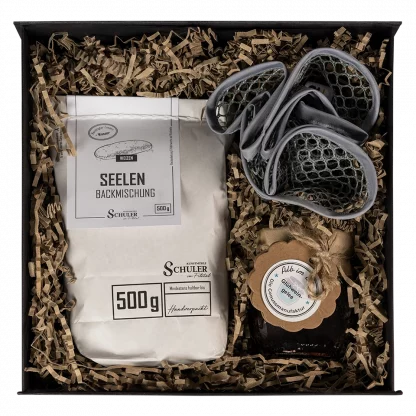 Bringe ein Stück schwäbische Gemütlichkeit nach Hause. In der Box steckt alles, was man für ein herzhaft-süßes winterliches Genusserlebnis braucht: Eine original schwäbische Seelen-Backmischung, die das beliebte Traditionsgebäck ganz einfach gelingen lässt, ein fruchtig-würziges Glühweingelee, das herrlich nach Weihnachten schmeckt, und ein praktischer Teiger, mit dem die Reinigung zum Kinderspiel wird. Ob als Geschenk oder zum Selbergenießen – diese Box vereint schwäbische Backtradition, weihnachtliche Aromen und liebevolle Handarbeit in einer stimmigen Komposition. Ein echtes Schmankerl aus’m Ländle!