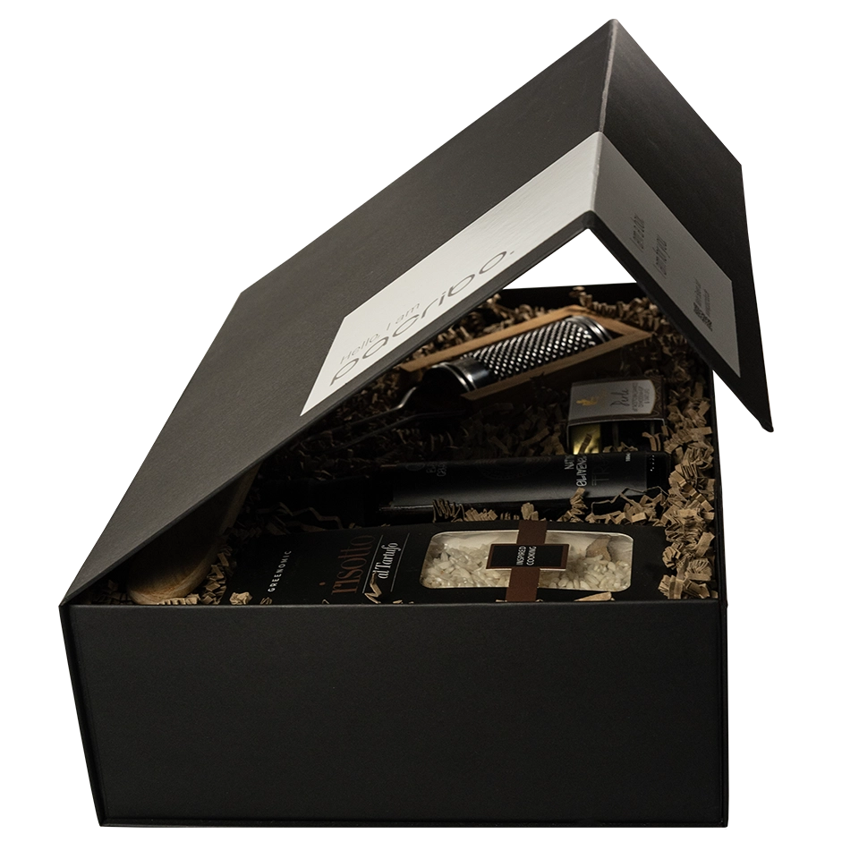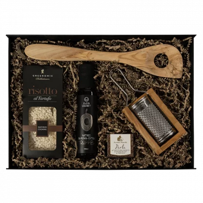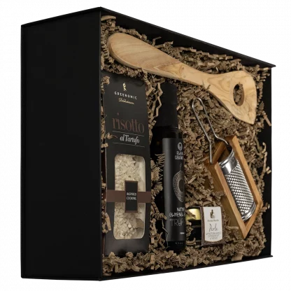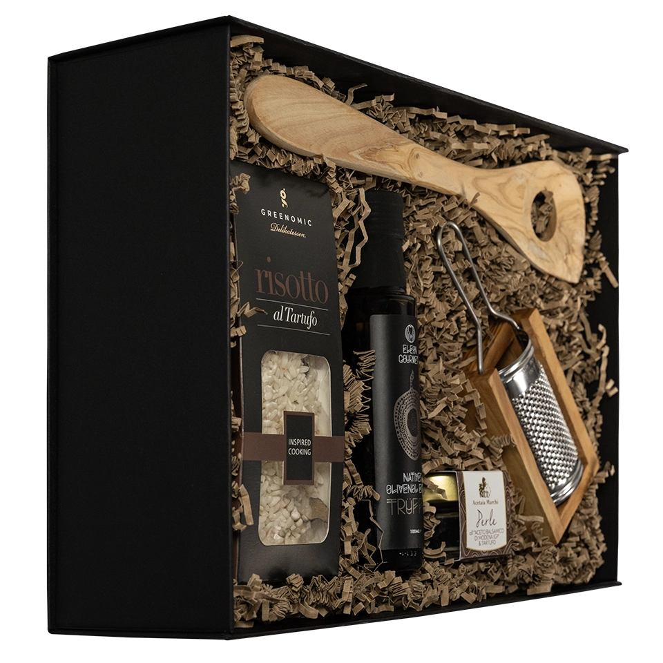 Für wahre Trüffelliebhaber – diese exklusive Box vereint alles, was man für ein außergewöhnliches Trüffelgericht braucht. Das aromatische Trüffel-Risotto lässt sich mühelos zubereiten und hat die perfekte Konsistenz. Mit dem hochwertigen Trüffelöl erhält das Risotto einen intensiven Geschmack, während die Balsamico Perlen mit Trüffel dem Gericht eine besondere Raffinesse verleihen. Abgerundet wird die Box durch eine praktische Parmesanreibe, mit der der Parmesan direkt und ohne Umstände über das Risotto gerieben werden kann. Der elegante Risottolöffel vollendet das Gericht stilvoll. Diese Box ist die perfekte Wahl für Genießer, die nicht nur das Besondere suchen, sondern auch die Qualität und Exklusivität von Trüffeln in jeder Zutat erleben möchten. Ideal für besondere Anlässe oder als luxuriöses Geschenk für wahre Feinschmecker.I'm a box. I'm a present.